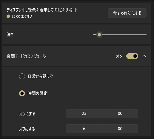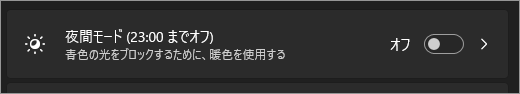 「夜間モード」を有効にする場合は「オン」にします。さらにクリックして詳細を出します。