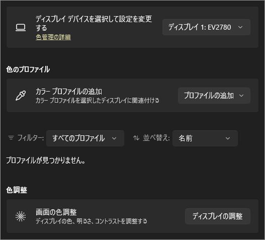 ここは、複数の画面を使っている場合に、どのディスプレイに対して色の設定を行うかを指定するための項目です。ノートPCの内蔵画面や外部モニターごとに、適用するカラープロファイルを個別に切り替えられるため、用途や表示特性に合わせた色調整ができます。