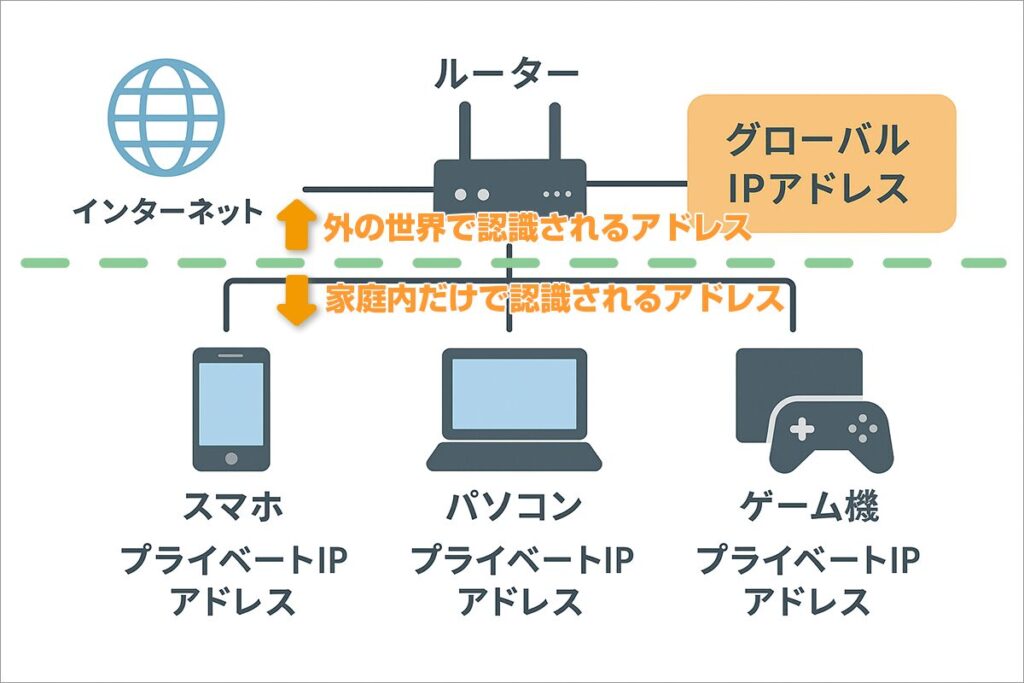 - 家の外には「グローバルIP」、中には「プライベートIP」がある。
