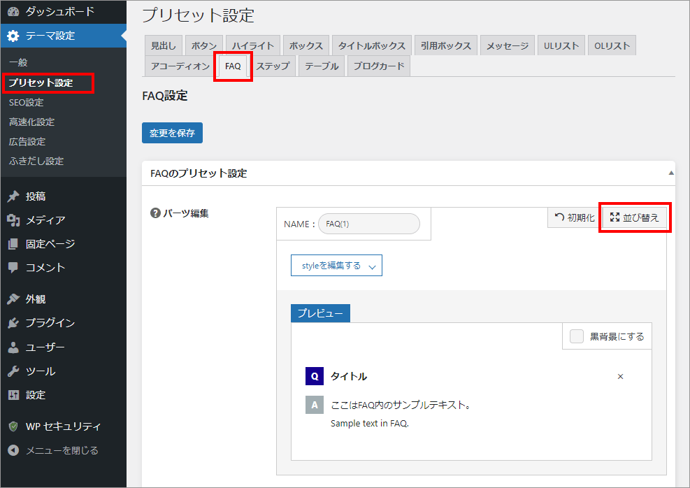 記事の編集の際にブロックエディタを使用すると表示されるプレビューが、ここの並び順と同じなので、多用するものを上に移動しておきます。「並び替え」を持って上に移動し「変更を保存」を押します。