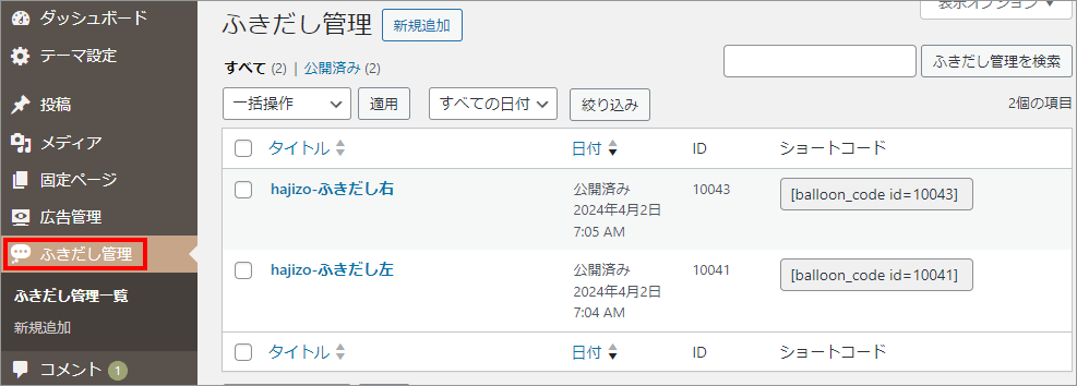 ふきだしを作るには下の画像のように、ダッシュボードの「ふきだし管理」を選び、「新規追加」ボタンを押し、次に出る設定画面(略)で必要事項を入力します。複数種類を作ることができます。