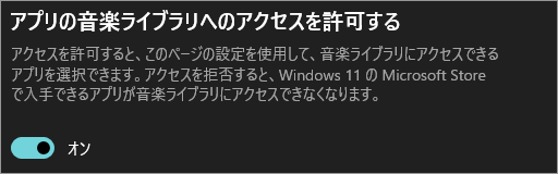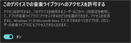 この項目は、Windows 11を使うこのPC全体として、音楽ライブラリへのアクセスを許可するかどうかを決める設定です。