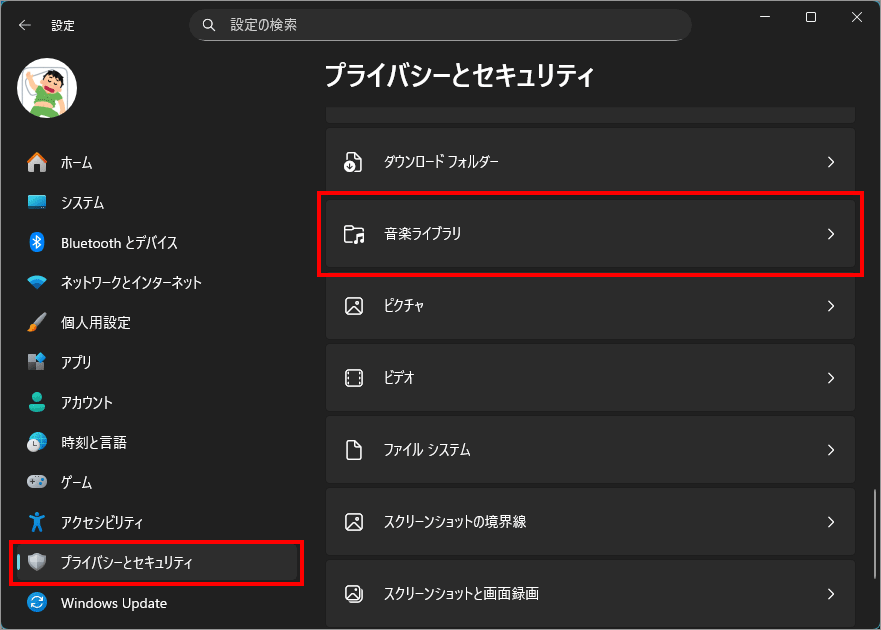 左メニュー「プライバシーとセキュリティ」を選択し、右側の「音楽ライブラリ」を選択します。