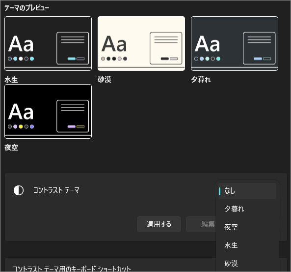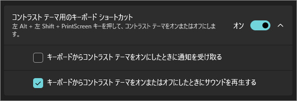 コントラスト テーマをキーボード操作だけで素早く切り替えるショートカットが用意されています。