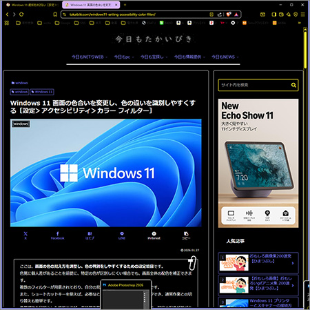 以上、Windows 11 画面の配色を高コントラストに切り替え、文字や操作を見やすくする[設定>アクセシビリティ>コントラスト テーマ]でした。