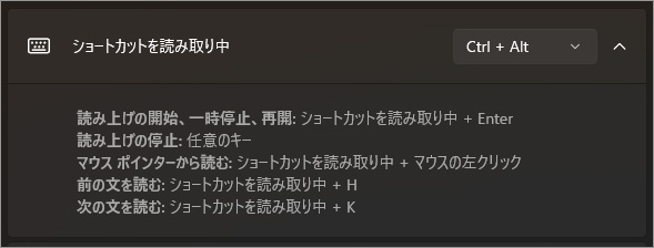 上の画像では「Ctrl + Alt + Enter」で拡大部分の読み上げが始り、何かしらのキーを押せば読み上げが停止する。