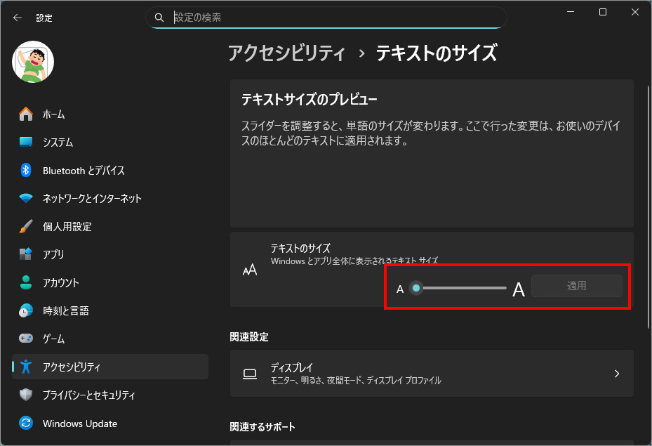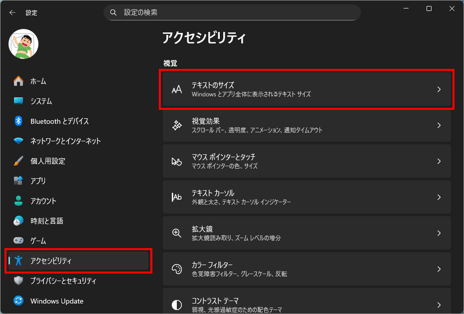 左メニュー「アクセシビリティ」を選択し、右側の「テキストのサイズ」を選択します。