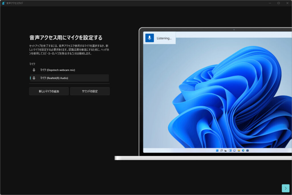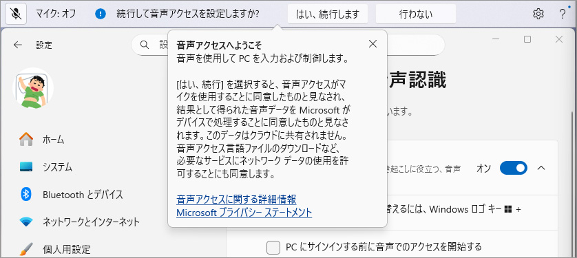 音声アクセスを「オン」(またはWindowsキー + Ctrl +S)にすると初回に下記の画面が出ます。「はい、続行します」で画面の指示に従います。