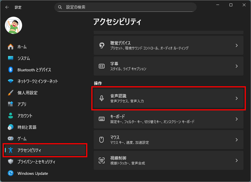 左メニュー「アクセシビリティ」を選択し、右側の「音声認識」を選択します。
