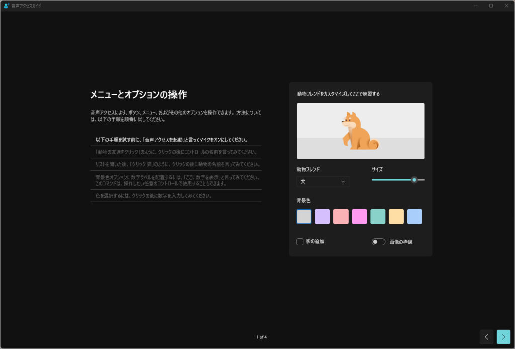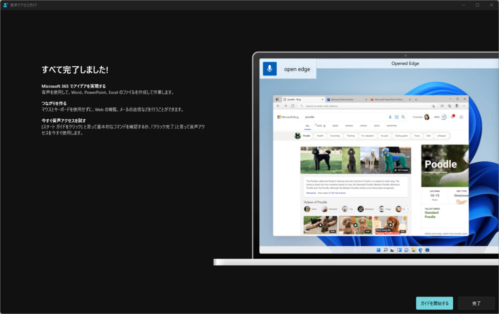 初期設定を完了すると、キーボードやマウスを使わずに、アプリの起動、ウィンドウ操作、ボタンのクリック、スクロールなどを音声コマンドで行えるようになります。
