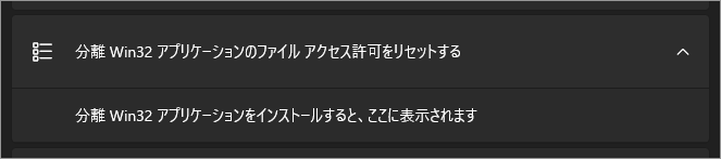 「分離 Win32 アプリケーションのファイル アクセス許可をリセットする」を実行すると、これまでに Win32 アプリへ与えたファイルアクセスの許可状態が初期状態に戻ります。