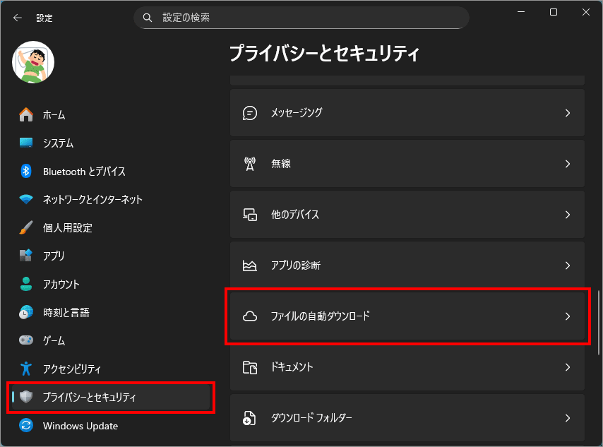 左メニュー「プライバシーとセキュリティ」を選択し、右側の「ファイルの自動ダウンロード」を選択します。