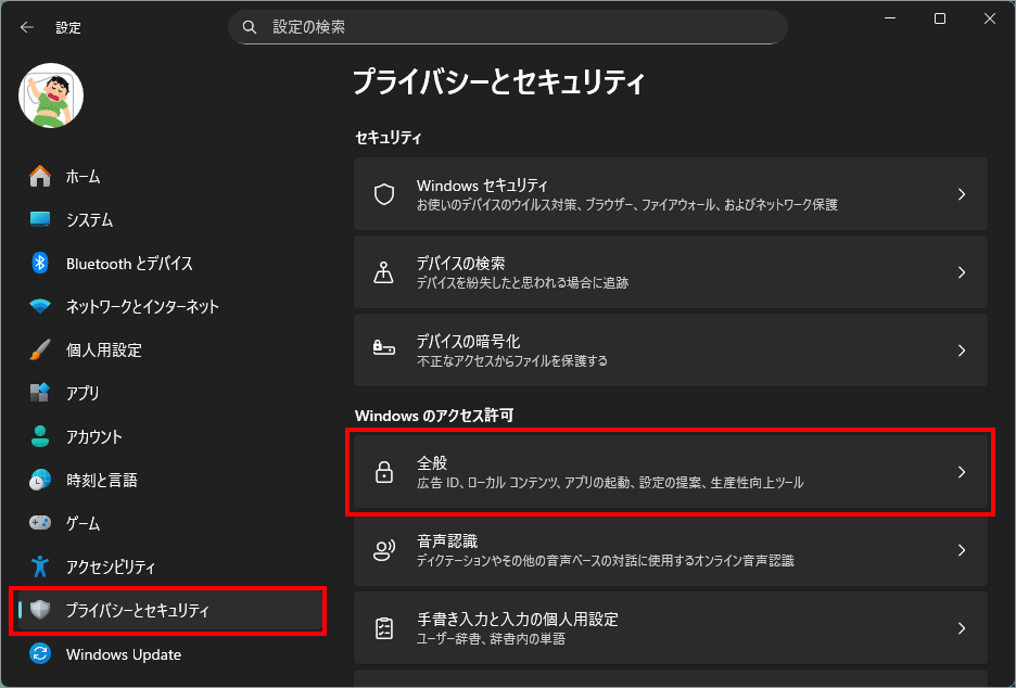 そんなときに見直しておきたいのが、[設定 > プライバシーとセキュリティ > 全般]にあるプライバシー関連のスイッチ群です。ここには、広告 ID の利用、アプリの追跡、提案表示など、Windows があなたの行動データをどう扱うかをまとめて管理できる項目が並んでいます。