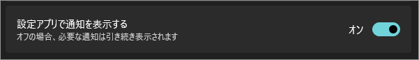 Windows 11 の「設定アプリで通知を表示する」は、設定アプリ内に表示される注意喚起・提案・ヒントなどの通知をオン/オフできる項目です。