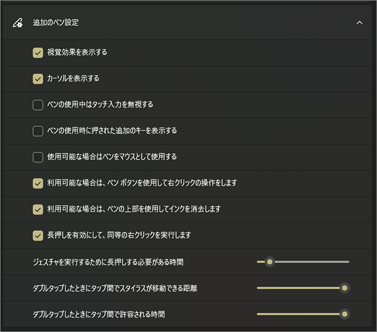 ペン入力に関する細かな挙動や補助機能を調整する設定です。 ここでは、ペン操作をよりマウス操作に近づけたり、誤操作を防ぐための調整を行います。