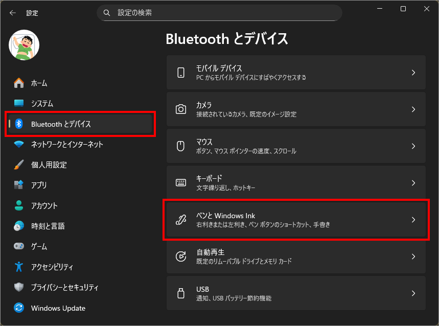 左メニュー「Bluetoothとデバイス」を選択し、右側の「ペンと Windows Ink」を選択します。