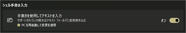 ペンを使って、文字入力を手書きで行うかどうかを切り替える設定です。オン/オフのスイッチで、Windows 11 全体の手書き入力機能を制御します。