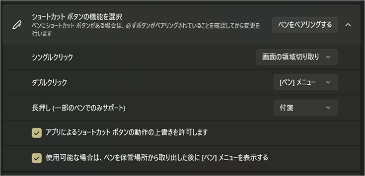 ペンに搭載されているボタン操作に、実行する動作を割り当てる設定です。
