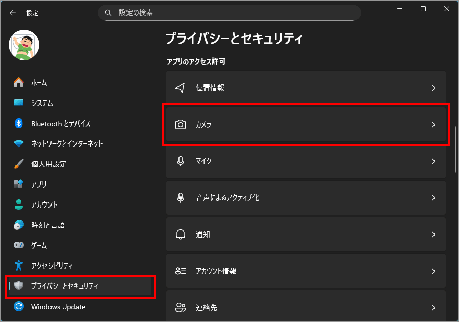 「設定 > プライバシーとセキュリティ > カメラ」にある「アプリにカメラへのアクセスを許可する」は、アプリごとにカメラの利用を許可・禁止できる個別設定です。