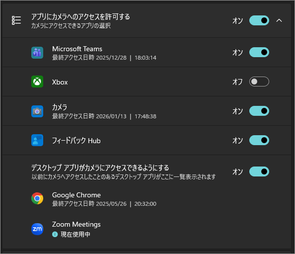 ここをオフにすると、Teams や Zoom、ブラウザなどすべてのアプリがカメラを利用できなくなります。