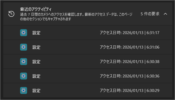 Windows 11 の「設定 > プライバシーとセキュリティ > カメラ」にある「最近のアクティビティ」は、どのアプリがいつカメラにアクセスしたかを確認できる履歴表示です。