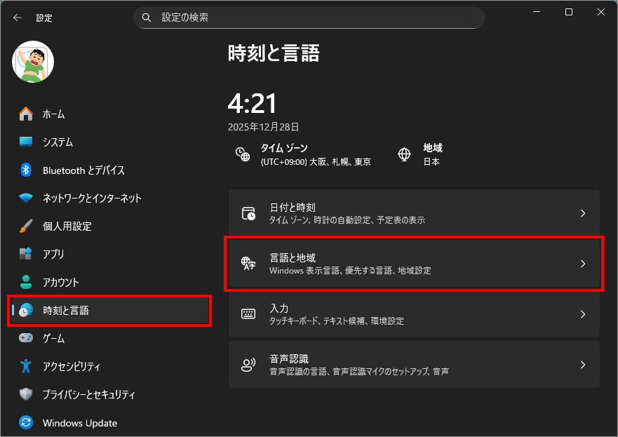 ここは、Windowsで使う言語や地域に関する設定をまとめて行う場所。表示言語やキーボード入力方式の追加・変更、音声認識の言語設定、日付や時刻、通貨、数値の表記形式などを、利用する国や地域に合わせて調整できる。日本語以外を使いたい場合や、海外仕様に合わせたいときに使います。