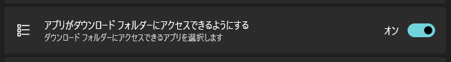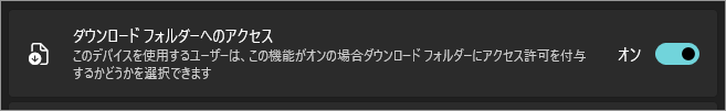 この設定をオンにすると、対応アプリがダウンロード フォルダーへ自由に保存・読み取りできるようになります。