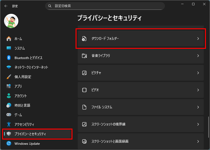 左メニュー「プライバシーとセキュリティ」を選択し、右側の「ダウンロード フォルダー」を選択します。