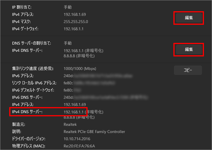 そこで、自動割り振りされている「イーサネット(またはWi-Fi)」項目の詳細の「IPv4DNSサーバー」の数字列を見つけます。