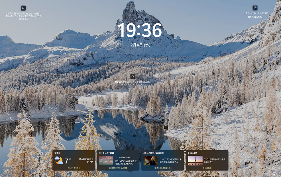 Windows 11では、ロック画面に背景画像やスライドショー、Windows スポットライトを設定できるほか、時刻や日付、天気、通知などの簡易情報を表示できます。これにより、サインイン前でも最低限の情報を確認できます。