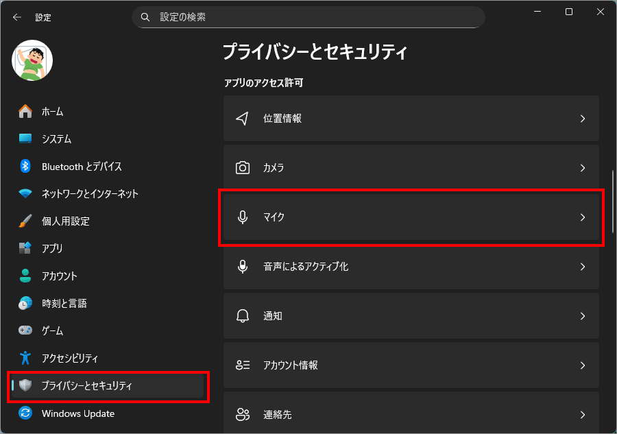 左メニュー「プライバシーとセキュリティ」を選択し、右側の「マイク」を選択します。