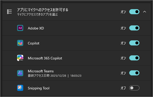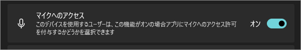 OS 全体の「マイクのアクセス」がオンであることが前提ですが、そのうえで「どのアプリに声を渡すか」を細かく制御できるのがこの項目です。不要なアプリのマイク利用を防ぐことで、プライバシーと安全性を高められます。