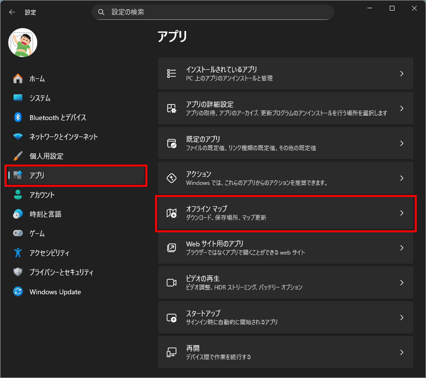 左メニュー「アプリ」を選択し、右側の「オフラインマップ」を選択します。