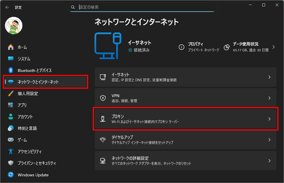 メニュー「ネットワークとインターネット」を選択し、右側の「プロキシ」を選択します。