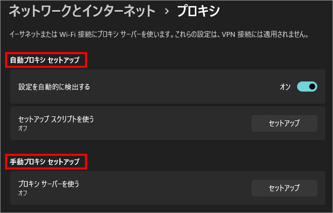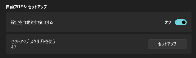 - 「設定を自動的に検出する」をオンにすると、ネットワーク環境に応じて自動的にプロキシが適用されます。