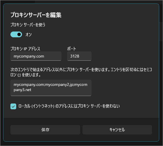 - 例:192.168.1.100:8080 や mycompany.com:3128