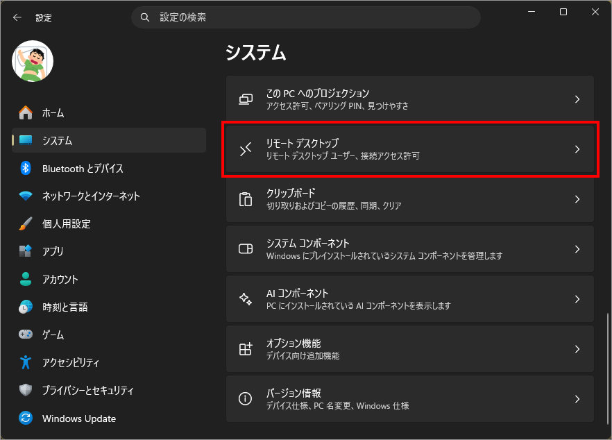 [設定 > システム > リモート デスクトップ]は、現在のWindows 11パソコンを別のパソコンから遠隔操作できるようにするための設定画面です。