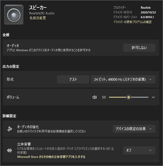一覧に表示されているスピーカーなどのデバイス名をクリックすると下の画像のようにそのデバイスに対して可能な設定が表示されます。