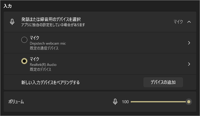 発話または録音用のデバイスを選択>マイク