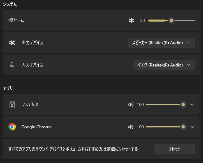 ここでは、スピーカーやヘッドホンなどの出力デバイス、マイクなどの入力デバイスを選択し、それぞれの音量を調整できます。