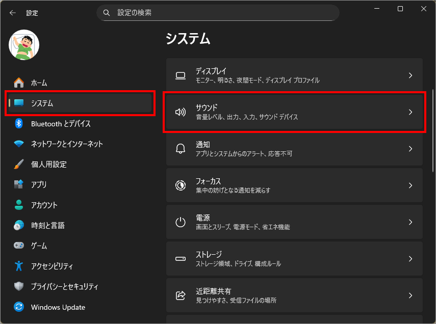左メニュー「システム」を選択し、右側の「サウンド」を選択します。