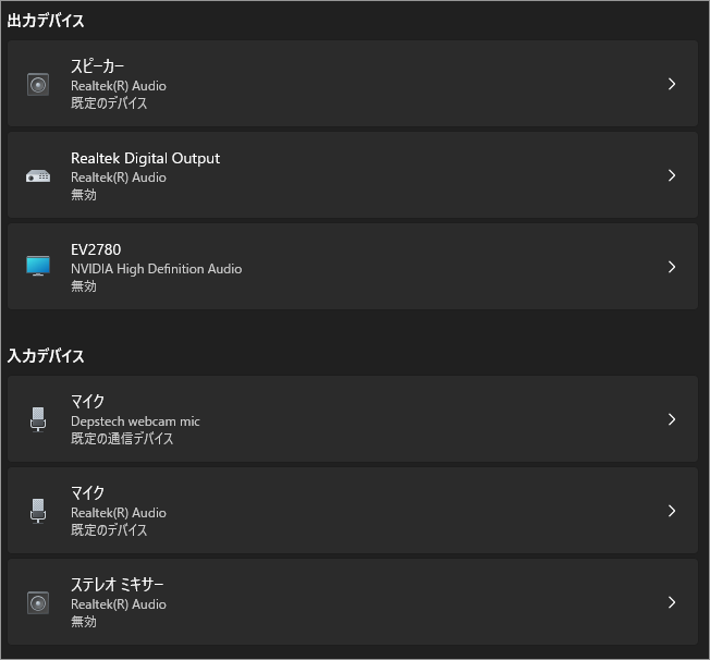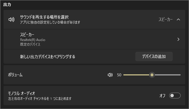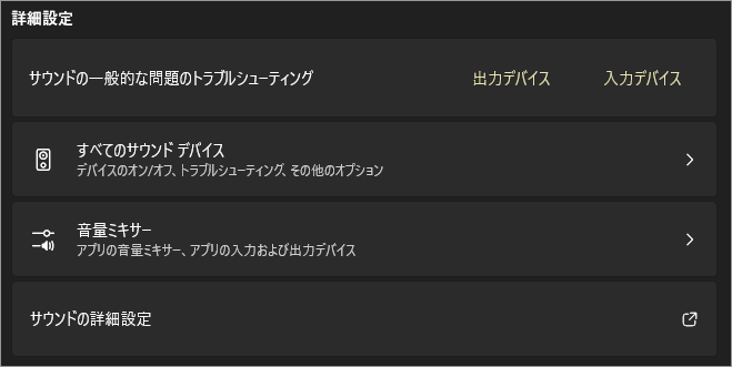 以上、Windows 11 音声の出力・入力や音量をまとめて調整する設定画面[設定>システム>サウンド]でした。