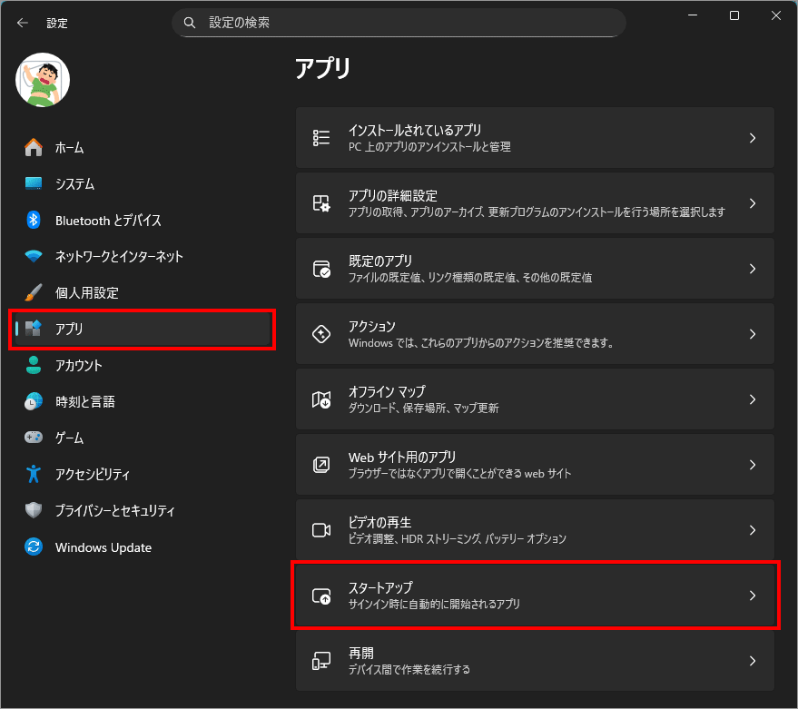 左メニュー「アプリ」を選択し、右側の「スタートアップ」を選択します。