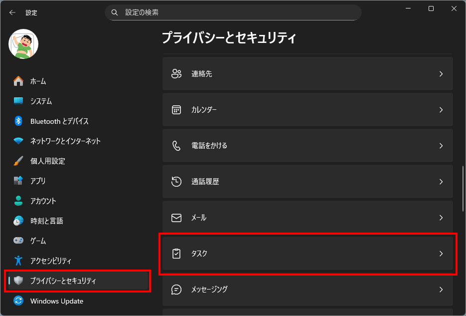 左メニュー「プライバシーとセキュリティ」を選択し、右側の「タスク」を選択します。