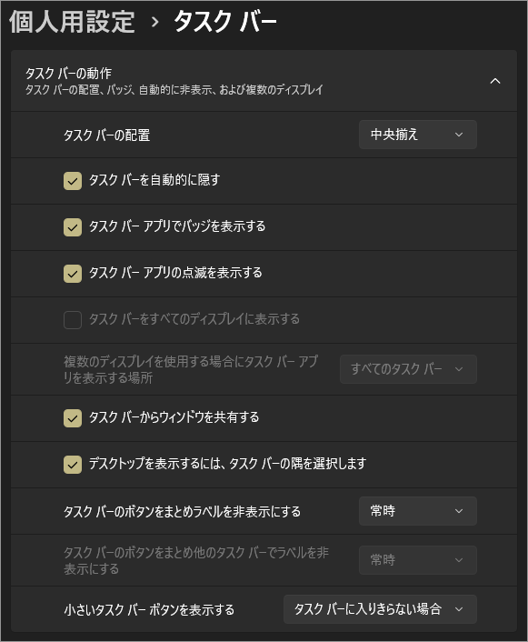 以上、 Windows 11 タスクバーに表示するアイコンや配置、動作を自分好みに設定する[設定>個人用設定>タスクバー]でした。