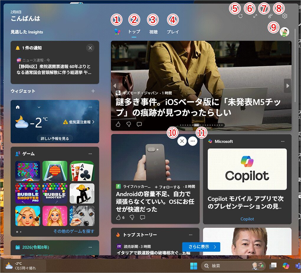 Microsoftが提供する情報ポータルへの入口です。ニュースや天気、エンタメなど、ウィジェット内の情報は主にMSNのコンテンツを基に表示されます。 - トップ