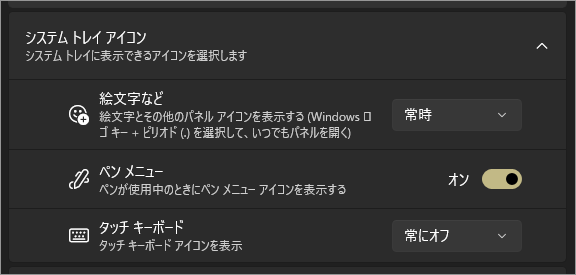 バックグラウンドで動作するアプリのアイコンを、タスクバーに表示するか隠すかを設定します。常駐アプリが多い場合の整理に役立ちます。システムトレイとは赤枠の部分です。