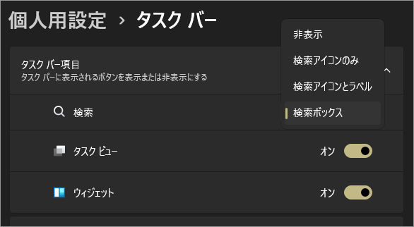 ここでは、スタートボタンや検索、ウィジェットなど、タスクバーに表示するアイコンのオン・オフを切り替えたり、アイコンの配置位置を変更したりできます。