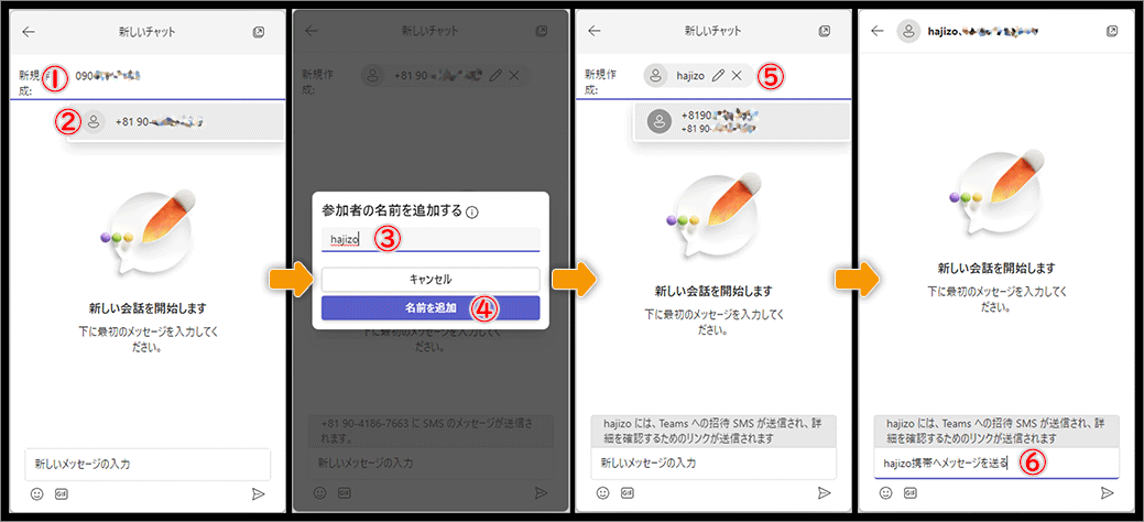 - 初めての連絡先の場合には電話番号かメールアドレスを入力します。今回は電話番号を入れます。