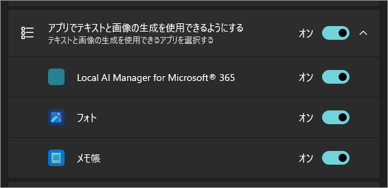 また、ここはWindows が提供するローカルの生成AIモデルを、どのアプリが利用しているかの透明性を高め、アプリごとに許可・不許可をコントロールできるようにする目的で用意されています。